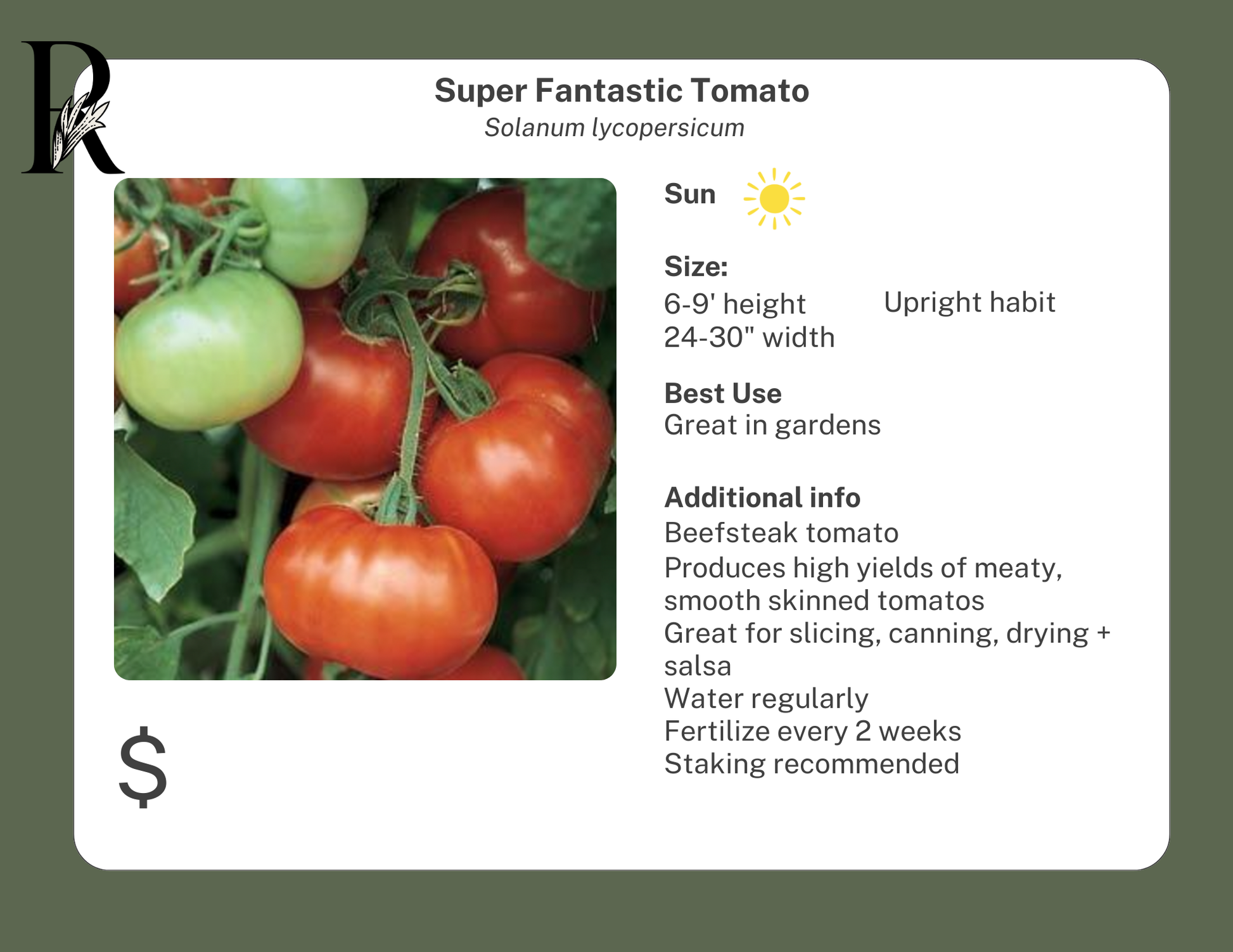 Super Fantastic tomato is a beefsteak tomato, producing high yields of meaty, smooth skinned tomatoes. Great for slicing, canning, drying and salsa.